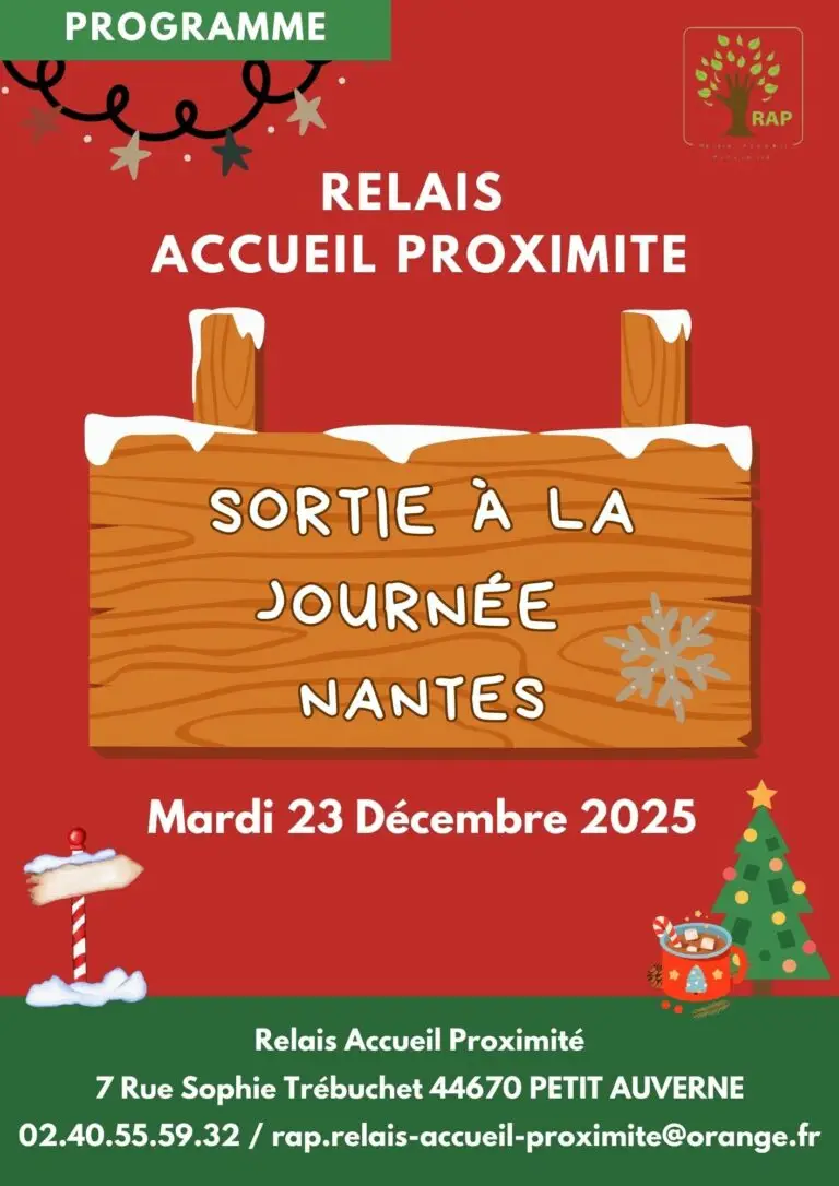Le RAP organise une sortie à Nantes le mardi 23 décembre, de 9h30 à 17h30. Au programme : Le trajet s’effectuera en train, au départ